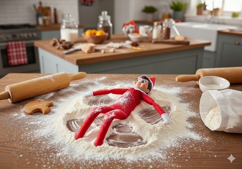 Spill a small amount of flour (or sugar) on the counter. Have the elf lie in it and move their arms and legs to make a “snow angel.” Just be prepared to wipe down the counter in the morning.